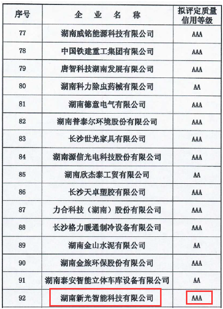 其中,湖南csgo电竞比分网智能科技有限公司被评为3A的质量信用等级企业之一