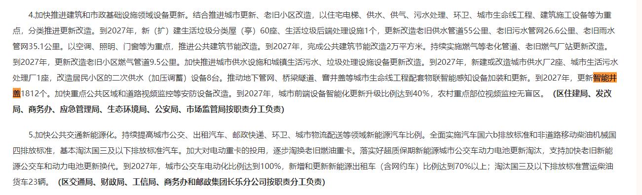 福州市长乐区人民政府关于印发《福州市长乐区推动大规模设备更新和消费品以旧换新行动实施方案》的通知,其中提到,到2027年,更新智能井盖1812个。