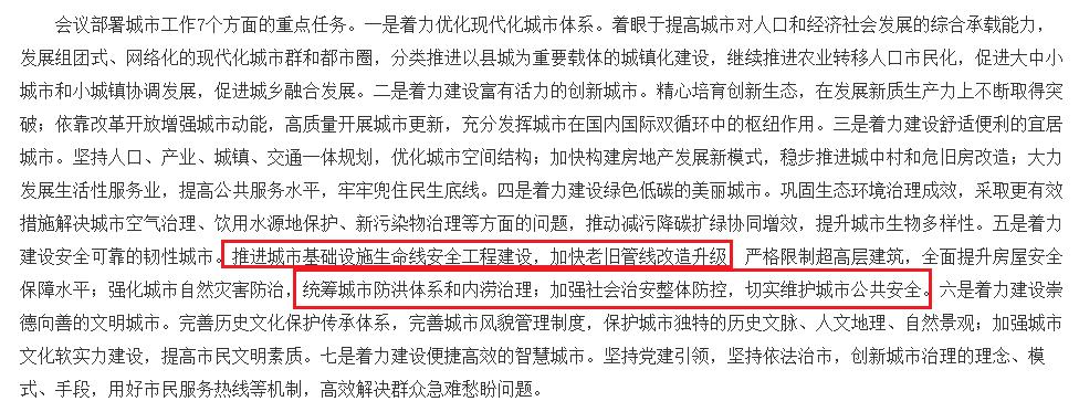 其中任务五是:着力建设安全可靠的韧性城市。推进城市基础设施生命线安全工程建设,加快老旧管线改造升级;严格限制超高层建筑,全面提升房屋安全保障水平;强化城市自然灾害防治,统筹城市防洪体系和内涝治理;加强社会治安整体防控,切实维护城市公共安全。