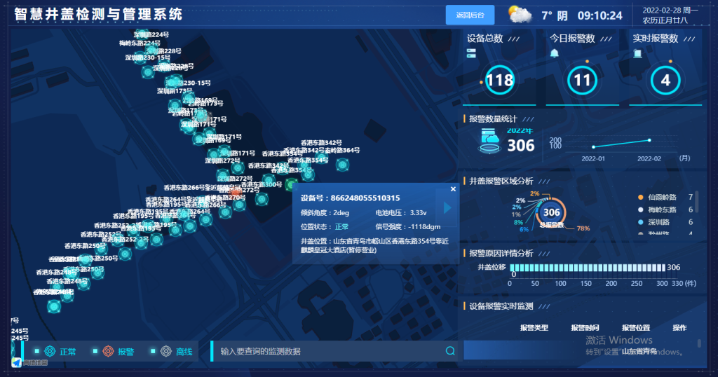 2月24日下午,在深圳路与香港东路交口北侧,设备安装工人将井盖翻转,露出监测设备的“真面目”,手掌大小的圆形监测仪就是井盖的“小管家”。刚打开井盖,就收到了来自智慧井盖监测管理系统的报警提示,准确定位到点位。通过监测管理系统,可浏览各监测点位的实时信息,直观了解系统运行情况,实现了远程巡检。